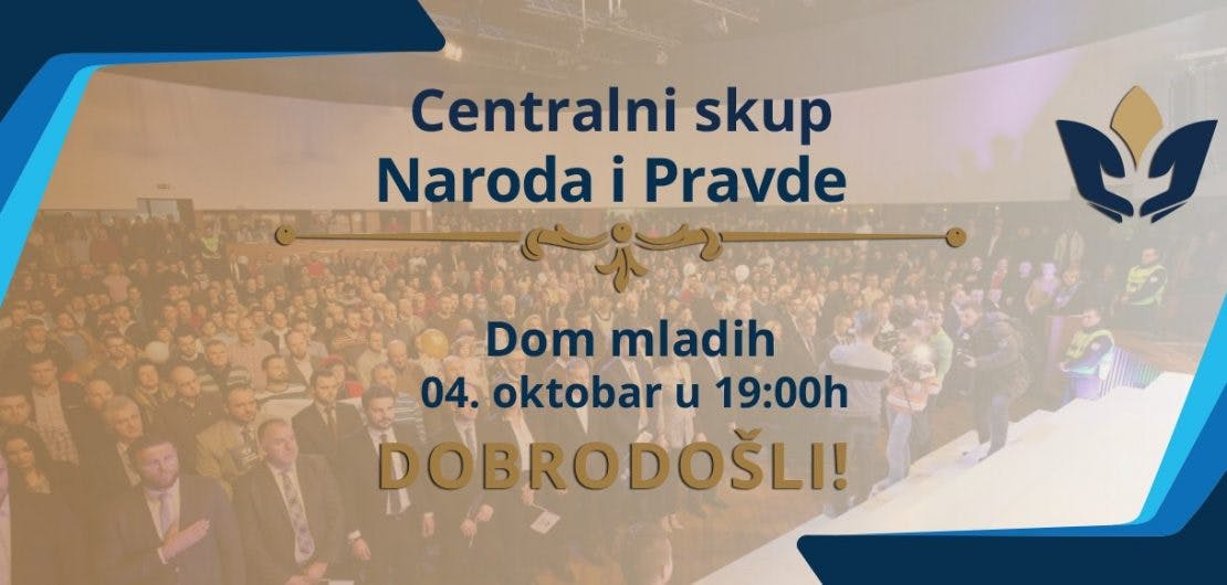 Pozivamo sve građane na Centralni predizborni skup Naroda i Pravde koji će se održati u četvrtak 4. oktobra 2018. godine sa početkom u 19.00 sati u Domu mladih na Skenderiji, tom simboličnom mjestu početka naše borbe za ostanak mladih u BiH, boljeg sutra za njih i sve građane BiH.