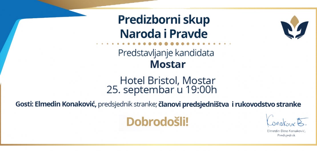 Predizborni skup Naroda i Pravde bit će održan u utorak, 25. septembra sa početkom u 19h u Hotelu Bristol, Mostar.