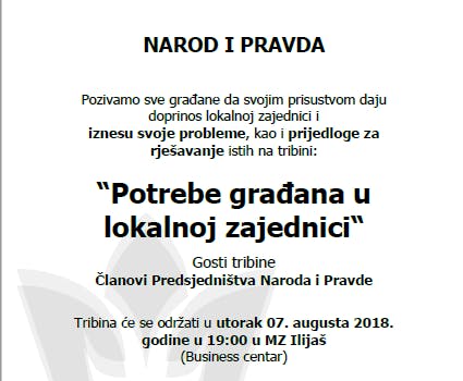 Pozivamo sve građane da svojim prisustvom daju doprinos lokalnoj zajednici i iznesu svoje probleme, kao i prijedloge za rješavanje istih. Gosti tribine su članovi Predsjedništva Naroda i Pravde.